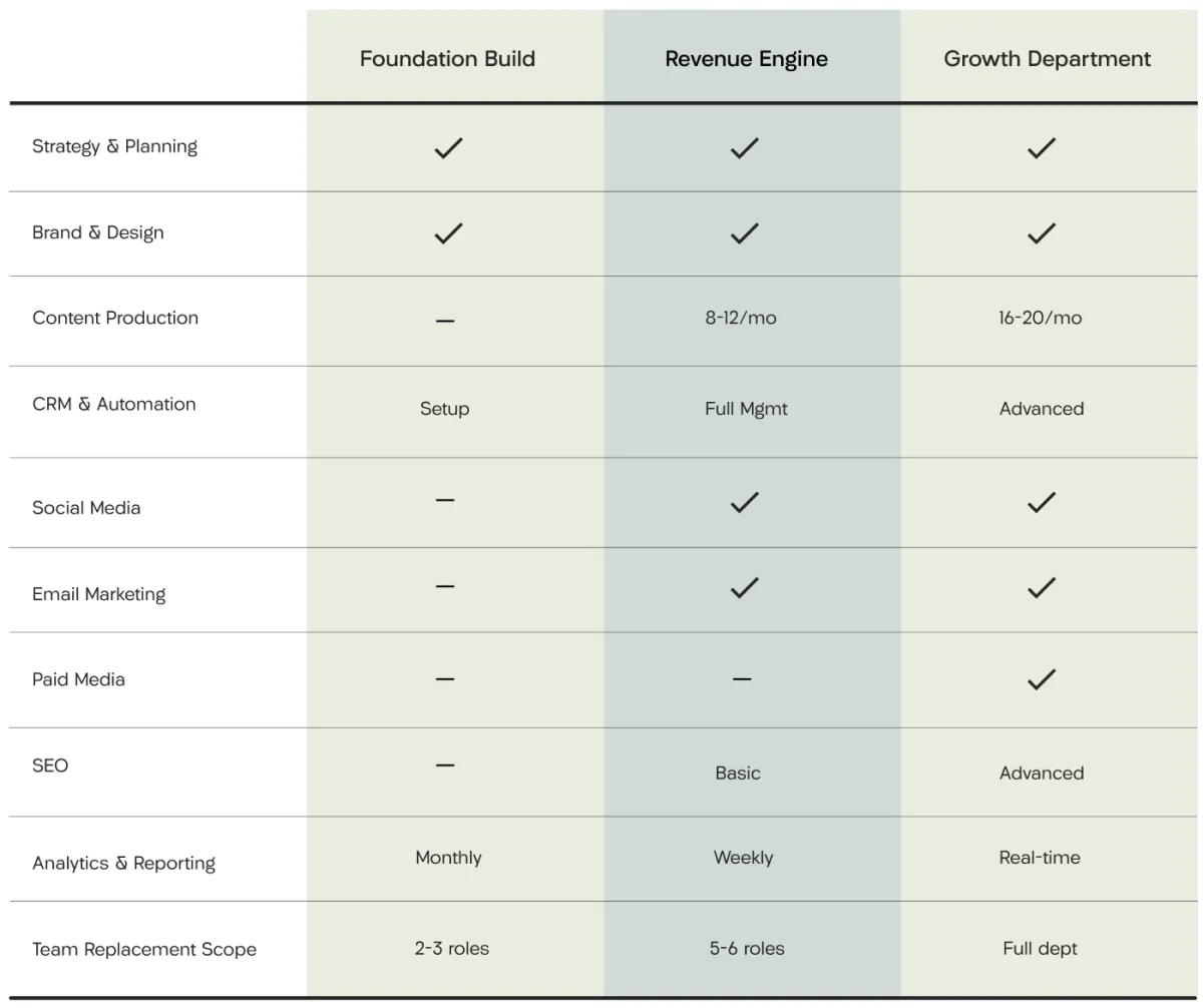 FoundryEvolux operates as an embedded growth department. Each tier is a complete operating model that replaces the need to hire and manage multiple internal specialists